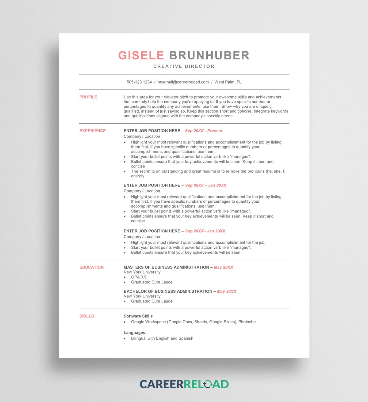 Besides great written content, you want your resume to look modern as well. You want it to be easy to read and for the recruiter to find all necessary information quickly. This is why you should use a modern formatted resume template. This resume template has proper margins and uses an easy-to-read font size (system font). The headings have been capitalized for them to better stand out. When filling in your resume, boldfacing growth percentages, dollar figures, and other key accomplishments is also a good strategy.